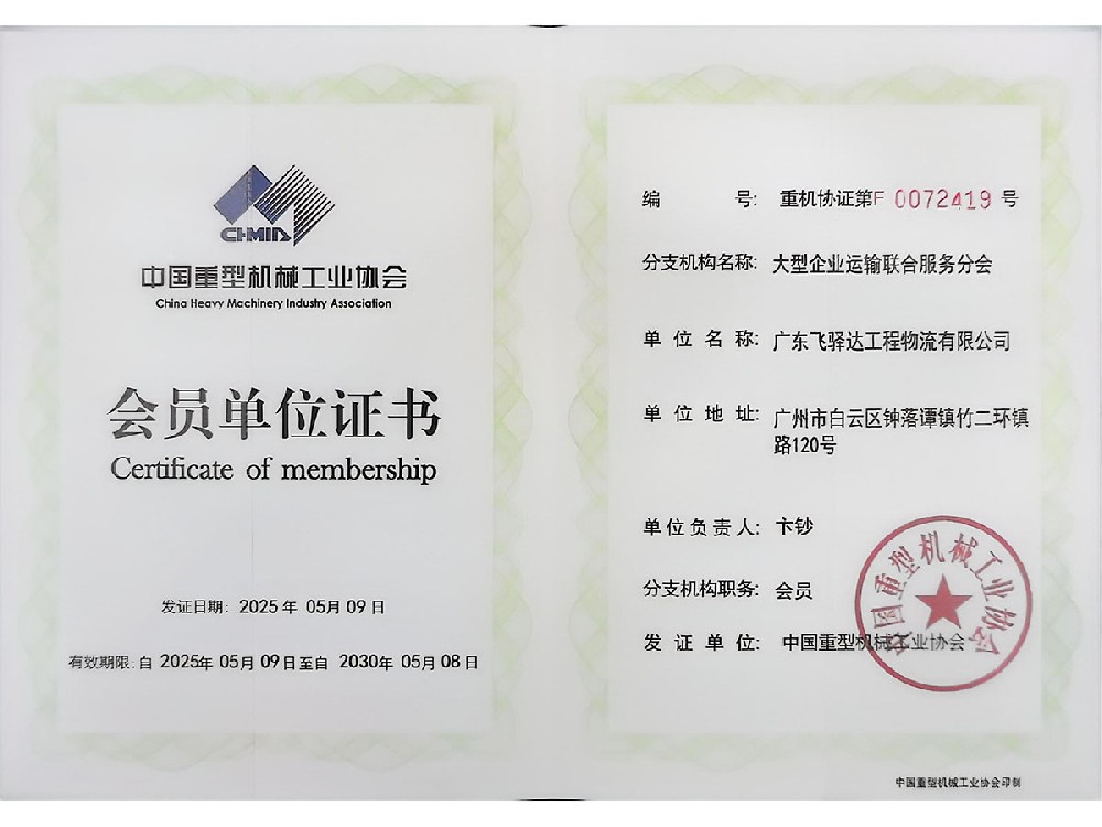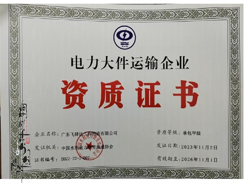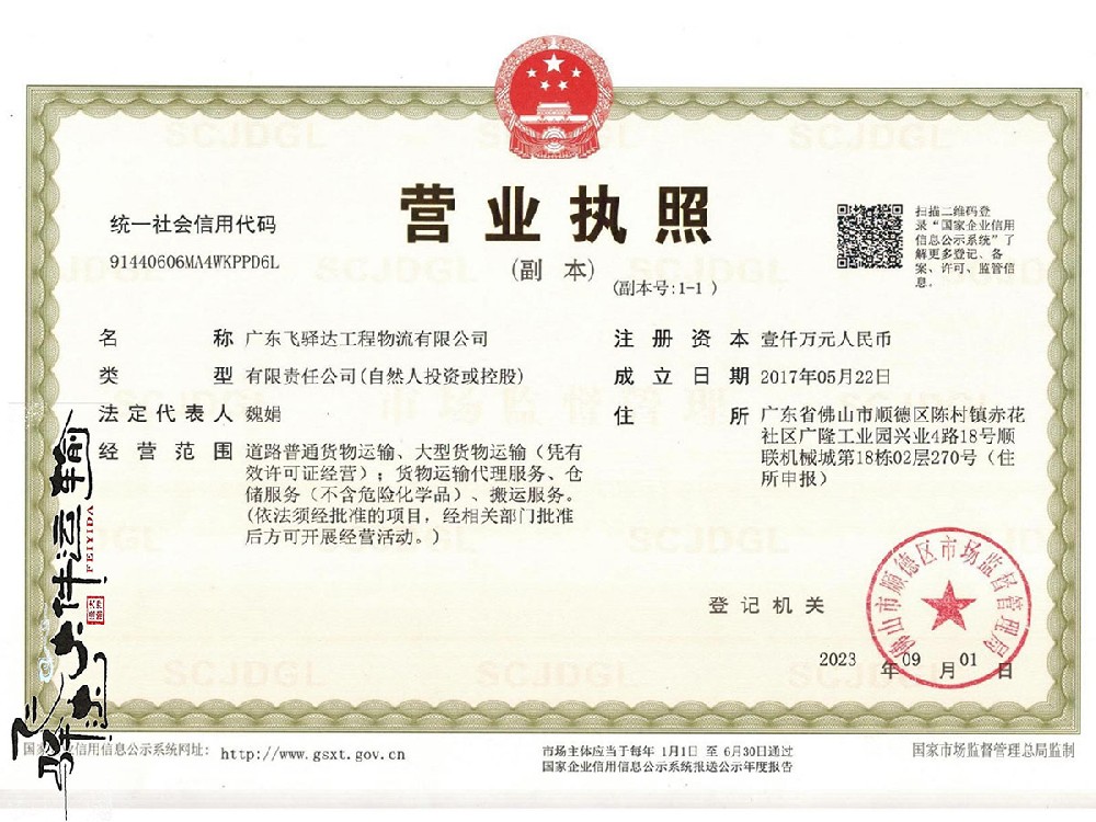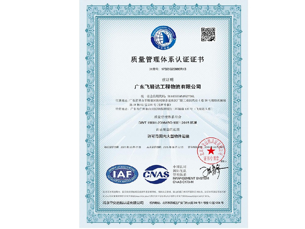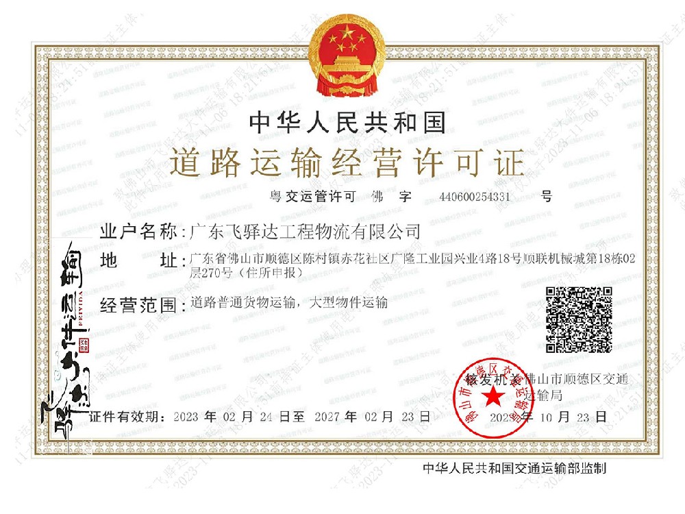 广东飞驿达工程物流有限公司于2017年05月22日成立,注册资金1000万元整,从事普通货物运输、大型货物运输、搬运服务(配备人工就位队)、货物运输代理业务等。我司运营总部位于广州市白云区钟落潭竹二环镇路120号,临近105国道和花莞高速公路,交通条件十分便利。我们是一家专业从事大型物件运输的有限责任公司,具备国内大型物件道路运输许可、电力大件运输总承包甲级,且所有服务均通过ISO9001:2008质量管理体系认证。公司占地1万余平方米,现有员工20余人,中高级技术人员占比43%,在深圳,佛山各有办事机构......